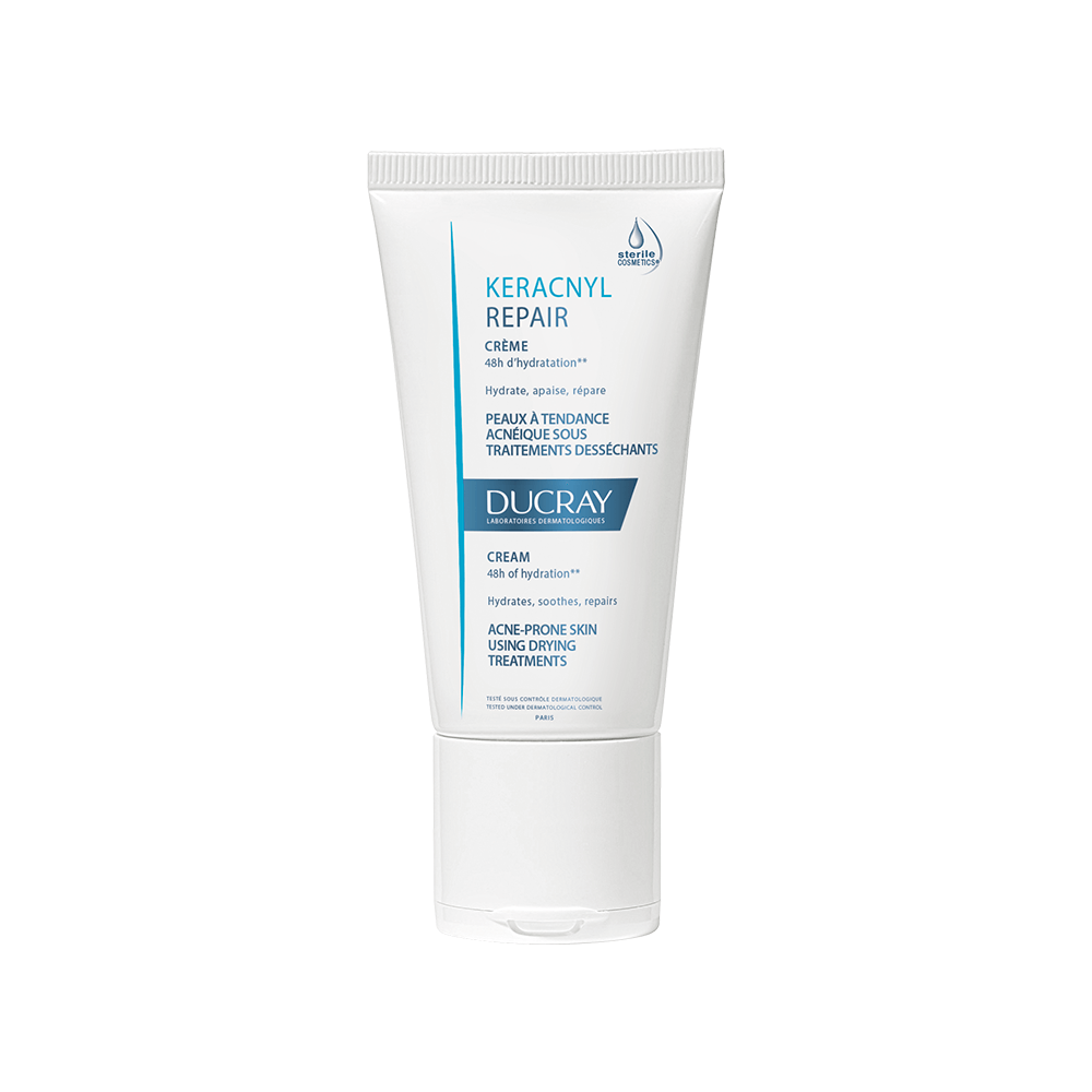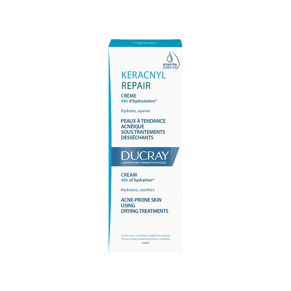 Rezultatai: oda jaučiasi daug komfortabiliau, sudrėkinta ir elastingesnė. Kliniškai įrodytas efektyvumas naudojant „Keracnyl Repair“ kremą kartu su vaistiniais medikamentais nuo aknės.